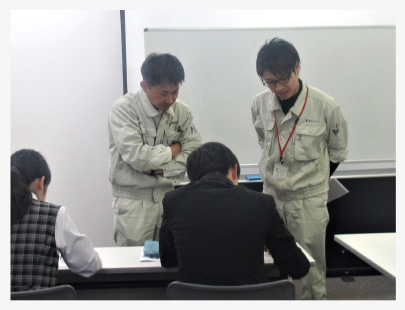 約1週間の研修が終了したあと、各研修先でのOJT研修に入ります。ヤマックスでは製造・営業・技術の3つの職種について研修を行います。実業務では職種間での協力が必須となりますので各職種での研修を行い、製品の製造からお客様に製品を引き渡すまでの一連の流れを学びます。