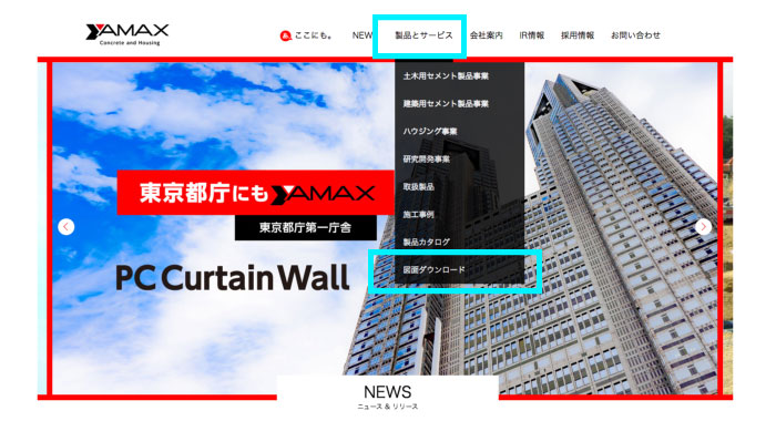 1.上部メニュー「製品とサービス」の「図面ダウンロード」を選択します。