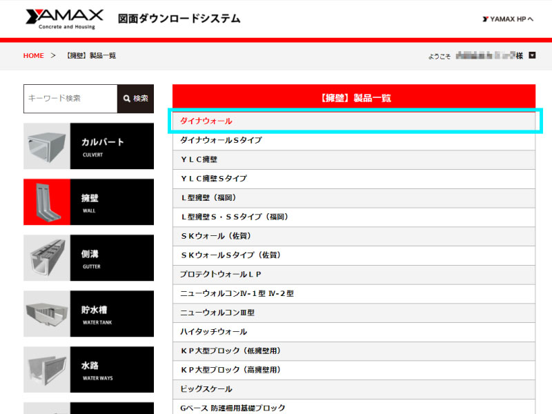 キーワード検索で「ダイナウォール」と入力するか、「擁壁」のリンクボタンをクリックします。