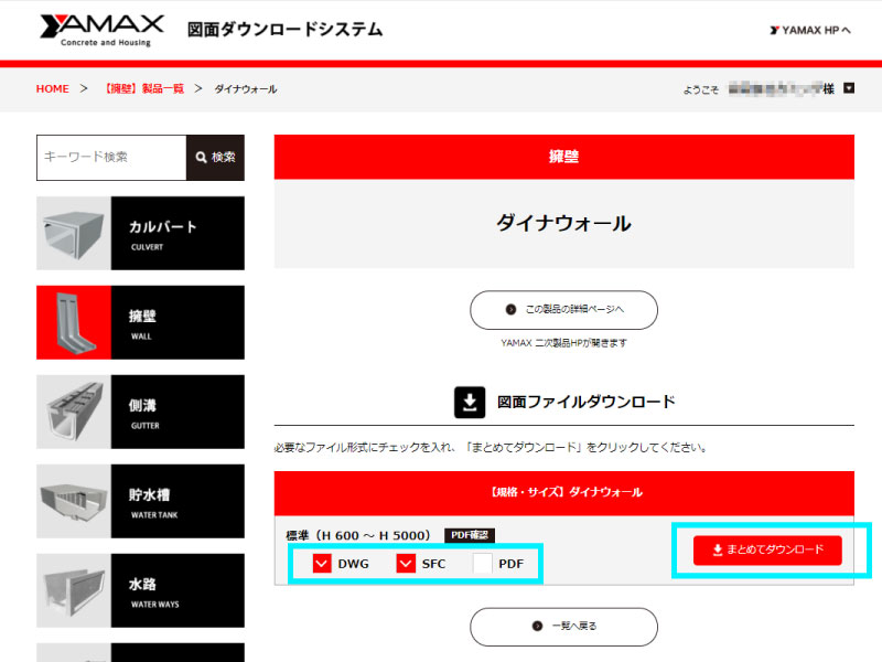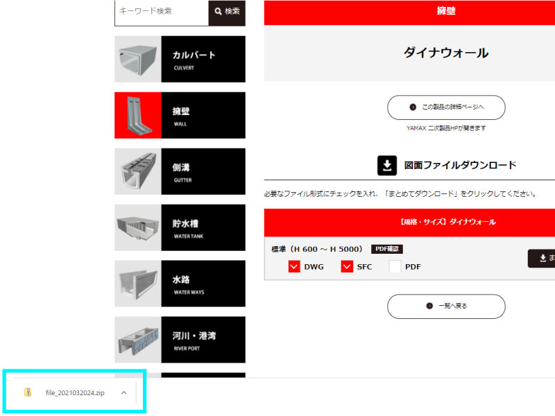 6.図面データはDWG、SFC、PDFの3種ご用意していますので、必要な形式にチェックを入れて「まとめてダウンロード」をクリックします。