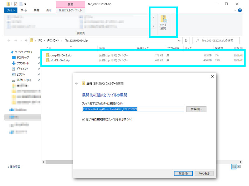 8.ダウンロードフォルダが開きますので、「すべて展開」をクリックして保存先のフォルダを選びファイルを保存してください。